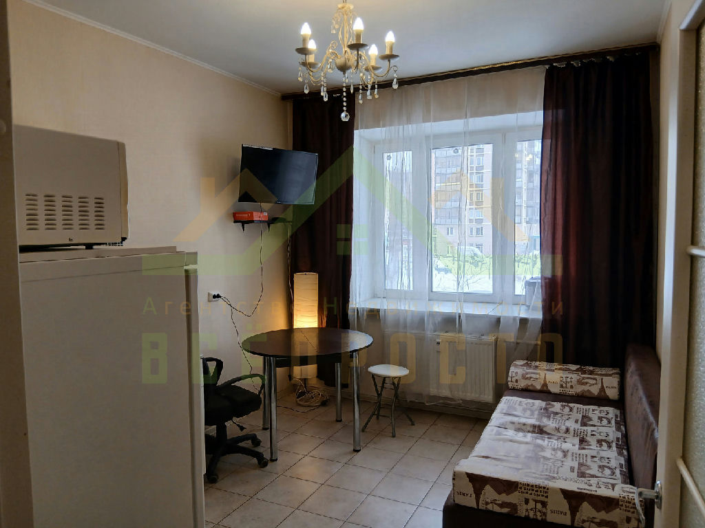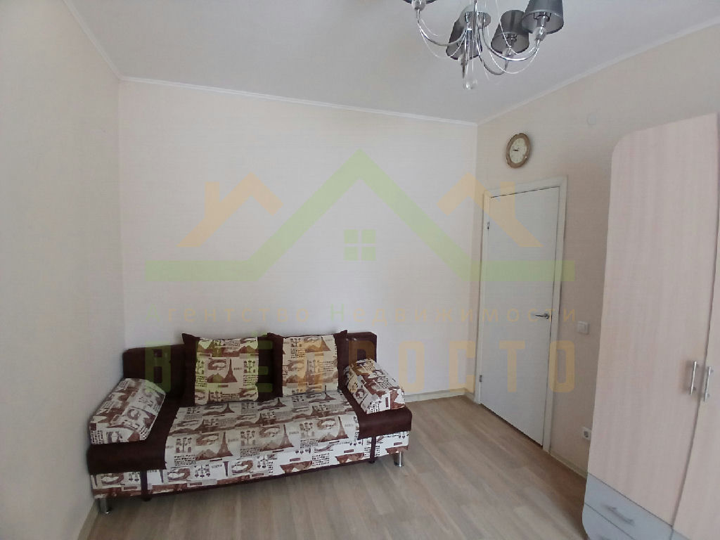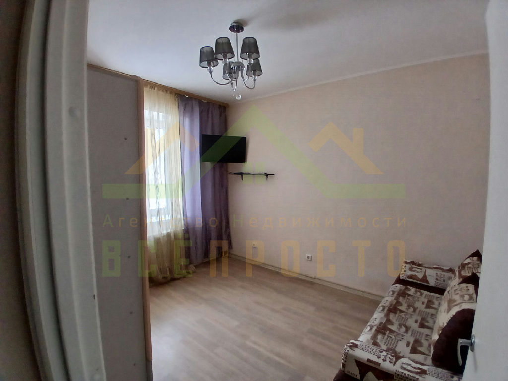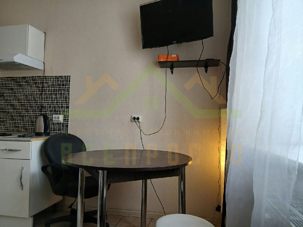 это комната с диваном, шкафом, телевизором и кухня с диваном, телевизором, кухонной мебелью, холодильником, микроволновкой и плитой.
